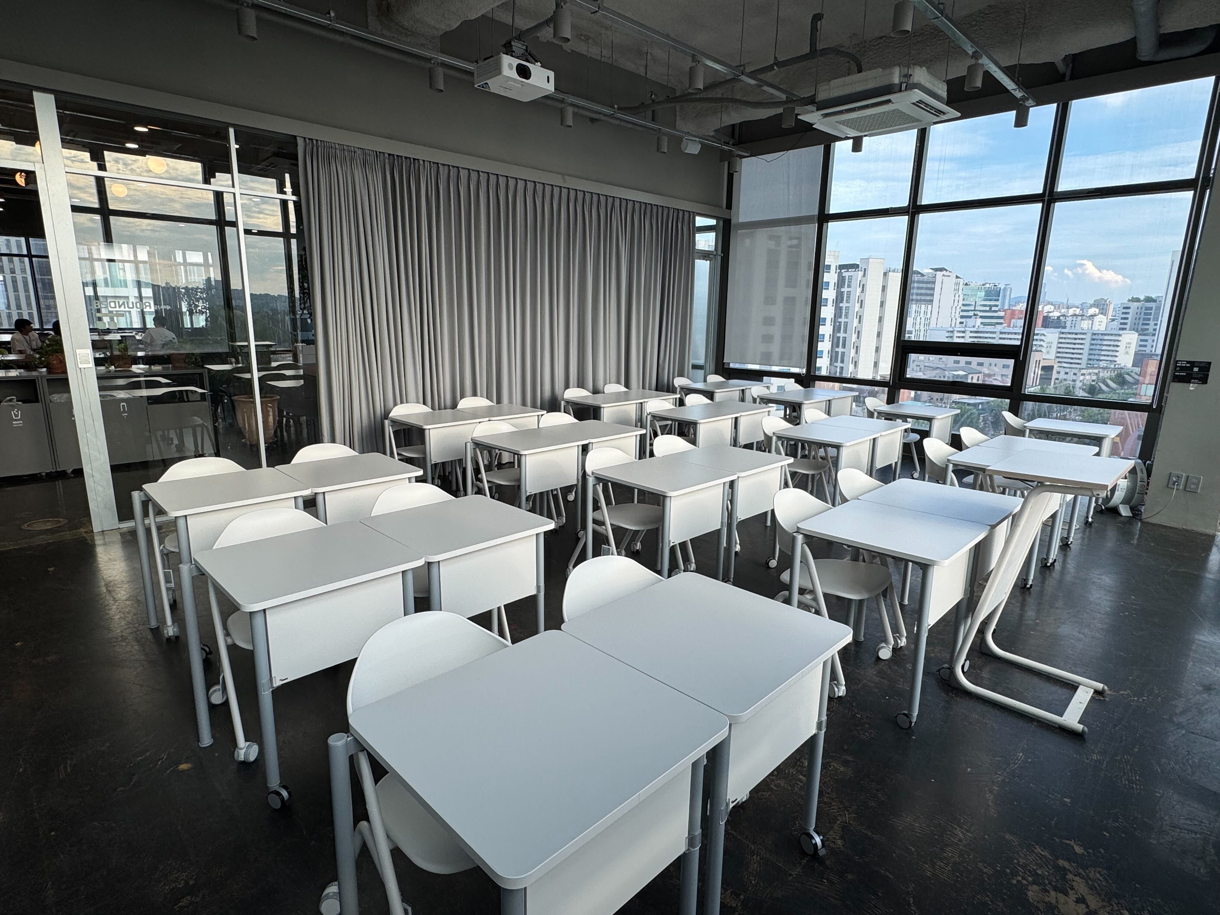 서울숲점 라운드28에 바퀴가 달린 책상과 의자로 가구를 교체했어요. 새 책상과 의자에는 바퀴가 달려있어 이제 드르륵드르륵하는 큰 소리 없이도 책상과 의자를 가볍게 이동할 수 있어요. 책상이 더 커졌고 모서리가 둥글어 다칠 위험이 적고 의자는 곡선 형태로 되어있어 이전보다 편하게 앉아 있을 수 있어요. 가구 배치를 변경하였다면 공간을 다 이용한 후에 원래의 배치대로 돌려놓아주시는 것, 잊지 마세요!