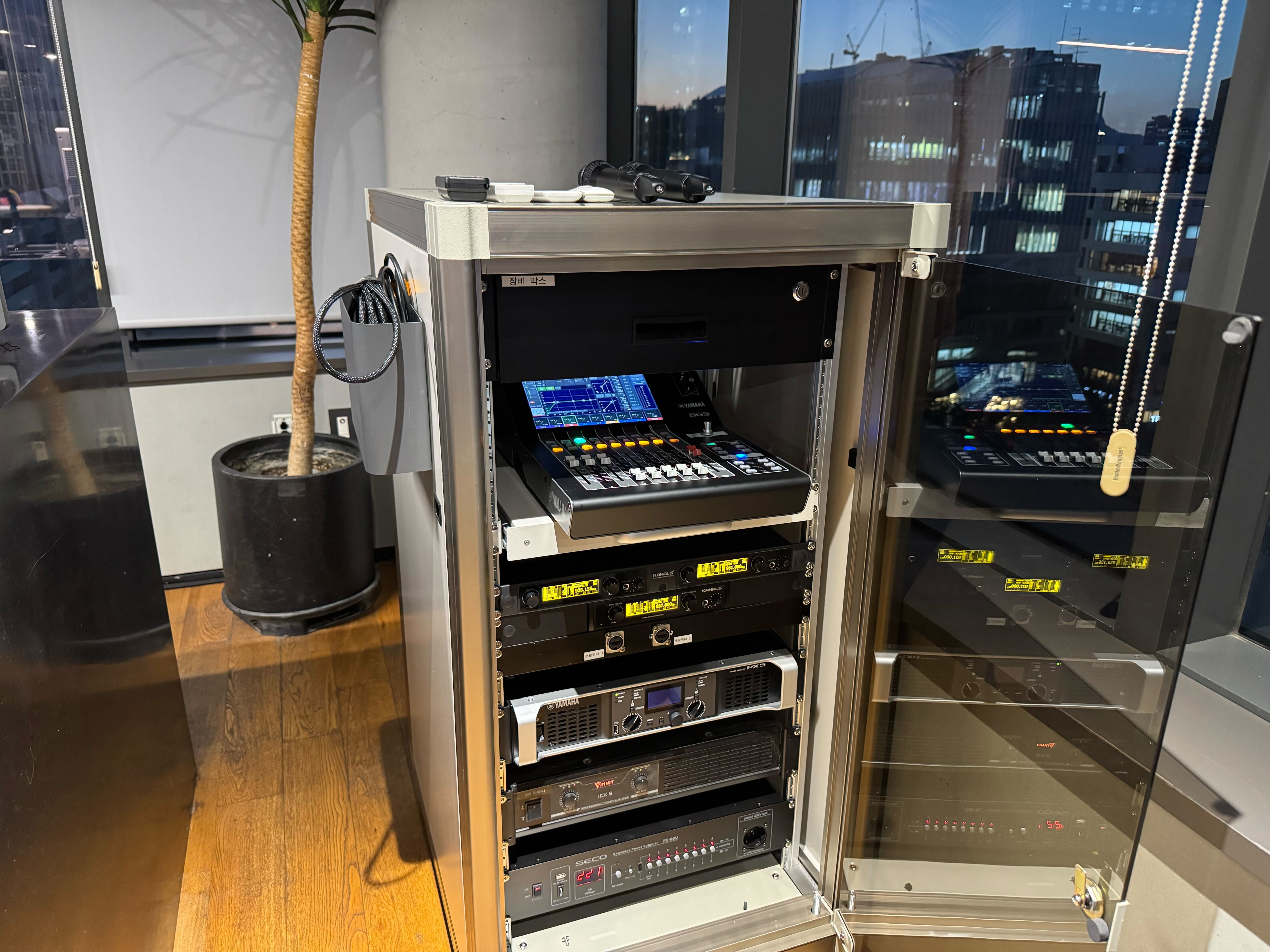 성수 시작점 8층 스카이라운지 음향 장비를 변경했어요. 2개의 무선 핸드 마이크와 1개의 무선 핀 마이크, 그리고 스피커도 1개 더 추가했습니다. 그래서 소리가 더욱 풍부하고 선명해졌고 소리 끊김이나 잡음이 들리지 않아요. 음향 설정을 최적화된 상태로 맞춰두었으니 사용하실 땐 음량만 조절해 주세요. 마이크와 리모컨은 사용 후 제자리에 원상 복구해 주세요.